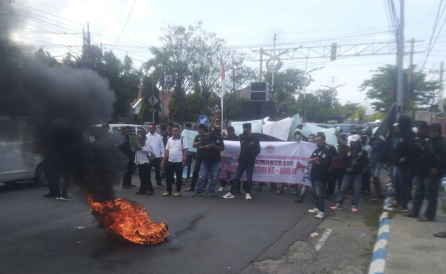 Aksi yang berlangsung di depan gedung Lembaga Peradilan Kabupaten berjuluk Kota Bahari itu diwarnai dengan bakar ban di depan Kejaksaan Negeri (Kejari) Sampang, dan di depan gedung PN Sampang. Selain aksi bakar ban, massa aksi terpantau juga sempat bersitegang dan nyaris bentrok dengan aparat kepolisian saat mau membakar ban di depan PN Sampang. Namun persitegangan itu tidak berlangsung lama setelah Ketua PN Sampang menemui massa aksi, dan mengajak perwakilan massa aksi untuk berdialog di salah satu ruangan PN Sampang.